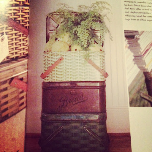 I though the stacking of these baskets was so cute. I loved that different colors of the baskets and mixing the Bread box in there for texture and color. Also love how the top basket has a tin, crab apples and greenery flowing out of it. So clever and simple! Beautiful!